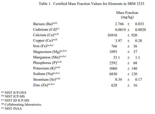 表 1 和表 2 提供了 SRM 3233 中元素和維生素的認證質量分數(shù)值,以干質量為基礎報告。NIST 認證值是 NIST 對其準確性有最高置信度的值因為所有已知或可疑的偏見來源都已被調(diào)查或考慮 [1]。價值分配分析由 NIST 和合作實驗室進行。認證值計算為 NIST 方法的平均值、美國農(nóng)業(yè)部 (USDA) 方法的平均值以及合作實驗室提供的平均結果的中位數(shù)(如果適用)。所有值在沒有加權的情況下合并。相關的不確定性以 95% 的置信水平表示 [2-4]。