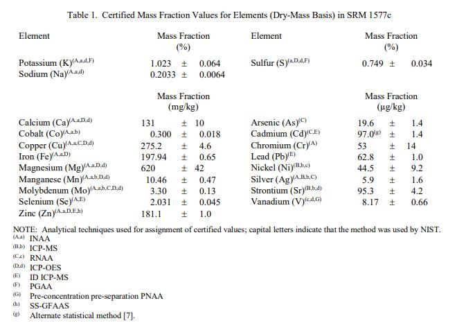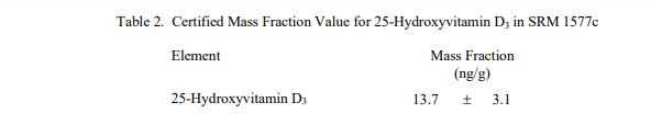 表 1 中提供了元素的認(rèn)證質(zhì)量分?jǐn)?shù)值。表 2 中提供了 25-羥基維生素. D3 的認(rèn)證質(zhì)量分?jǐn)?shù)值。元素的認(rèn)證值基于所執(zhí)行的主要分析技術(shù)的結(jié)果在 NIST 或在 NIST 和合作專家實驗室獲得的兩種或多種化學(xué)獨立分析技術(shù)的組合結(jié)果 [1]。 25-羥基維生素 .D3 的認(rèn)證值基于 NIST 和合作專家實驗室的綜合結(jié)果。 NIST 認(rèn)證值是 NIST 對其準(zhǔn)確性具有最高置信度的值,因為所有已知或可疑的偏差來源都已被調(diào)查或考慮在內(nèi) [1]。