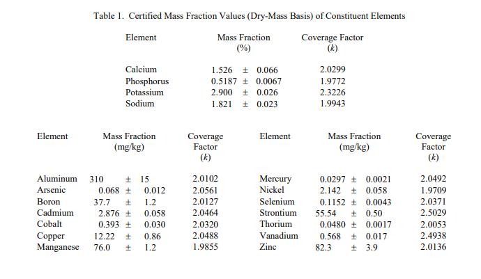 表 1 中提供了以干質(zhì)量為基礎(chǔ)報(bào)告的選定組成元素的認(rèn)證質(zhì)量分?jǐn)?shù)值。NIST 認(rèn)證值是 NIST 對(duì)其準(zhǔn)確性有最高置信度的值,在所有已知或已調(diào)查或考慮了可疑的偏見(jiàn)來(lái)源帳戶(hù) [1]。